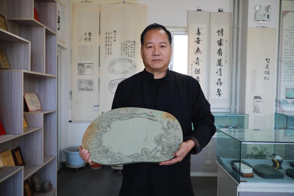 洪绪龙向记者展示自己的洮砚作品。新华社记者梁军 摄