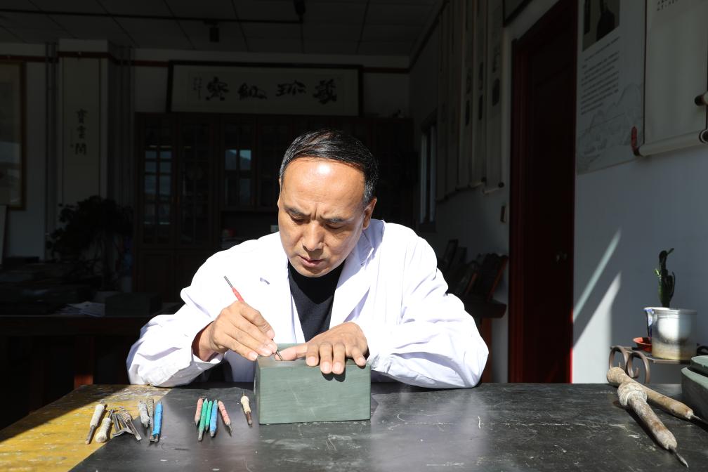 卢保胜在工作室创作洮砚。新华社记者梁军 摄