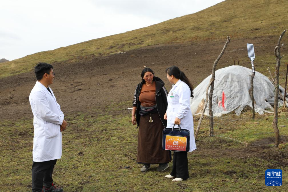 王蒋艳为牧民索南草测量血压。新华社记者 梁军 摄
