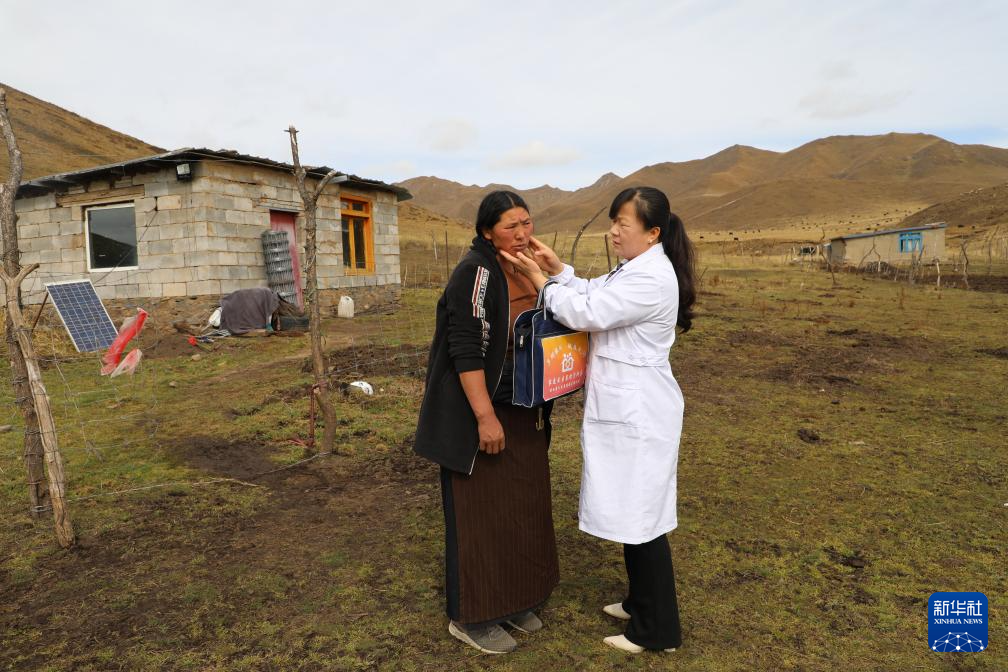 王蒋艳在屋外为牧民索南草检查伤口。新华社记者 梁军 摄