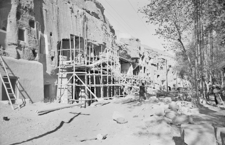 工作人员对莫高窟部分洞窟进行加固施工(1964年7月8日摄)。敦煌研究院供图